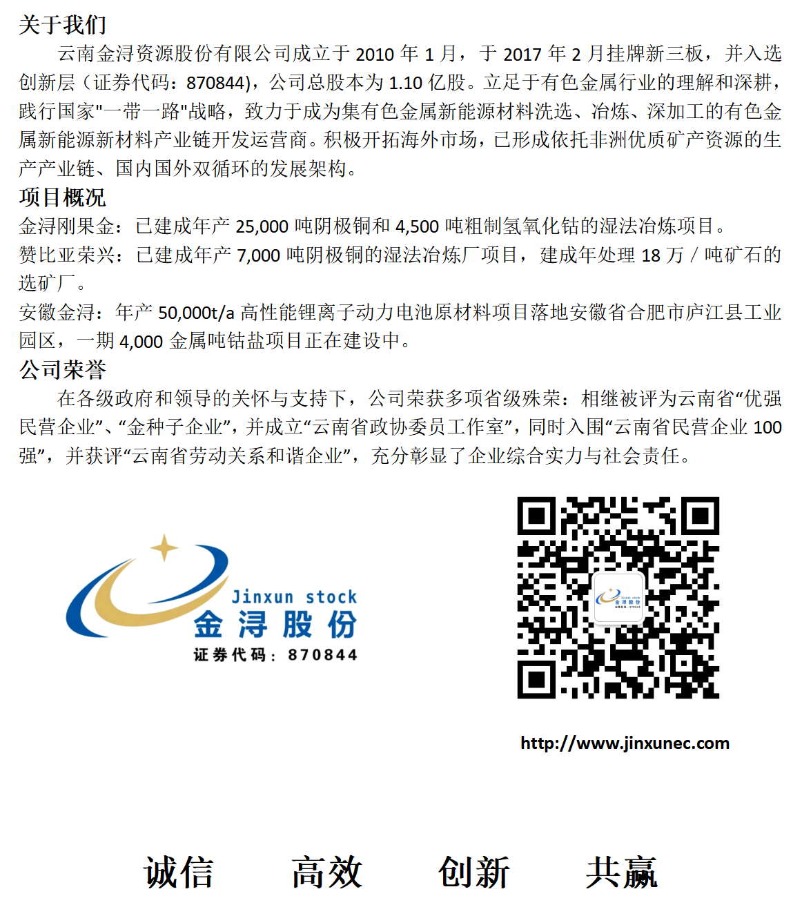 金浔股份将以此次入选“省级内外贸一体化重点企业名单”为契机,继续聚焦铜、钴等战略性资源,进一步发挥海外资源优势,做好矿产资源冶炼、深加工和资源综合循环利用,同时加大技术研发和创新投入,在国内实施新能源、新材料项目布局,实现产业链的贯通及产业链价值最大化。